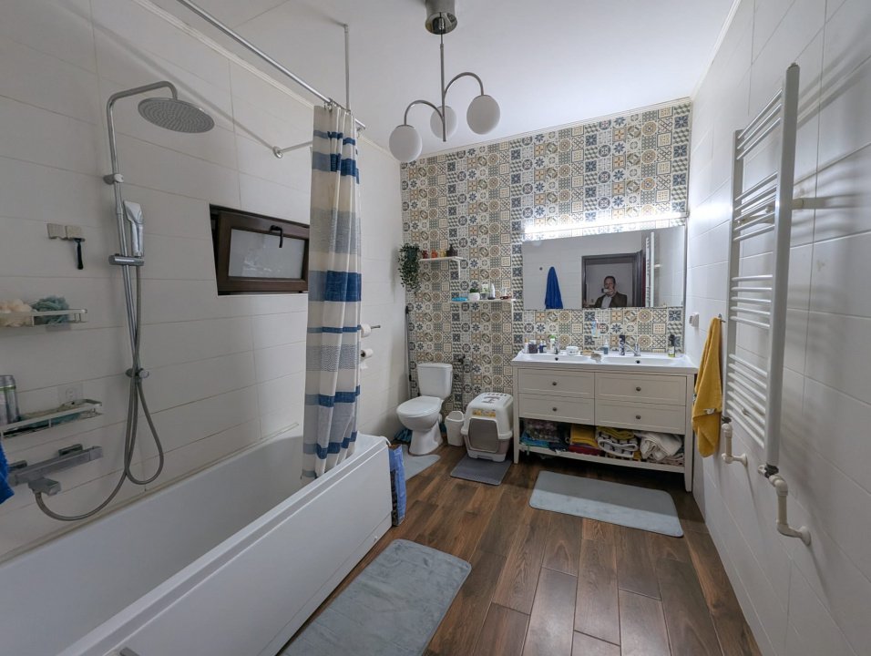 Casa are 4 camere, este total mobilata si utilata, are un Living spatios, trei dormitoare luminoase, baie mare cu fereastra, dressing, camera tehnica, iar bucataria are iesirea catre terasa din spatele casei.