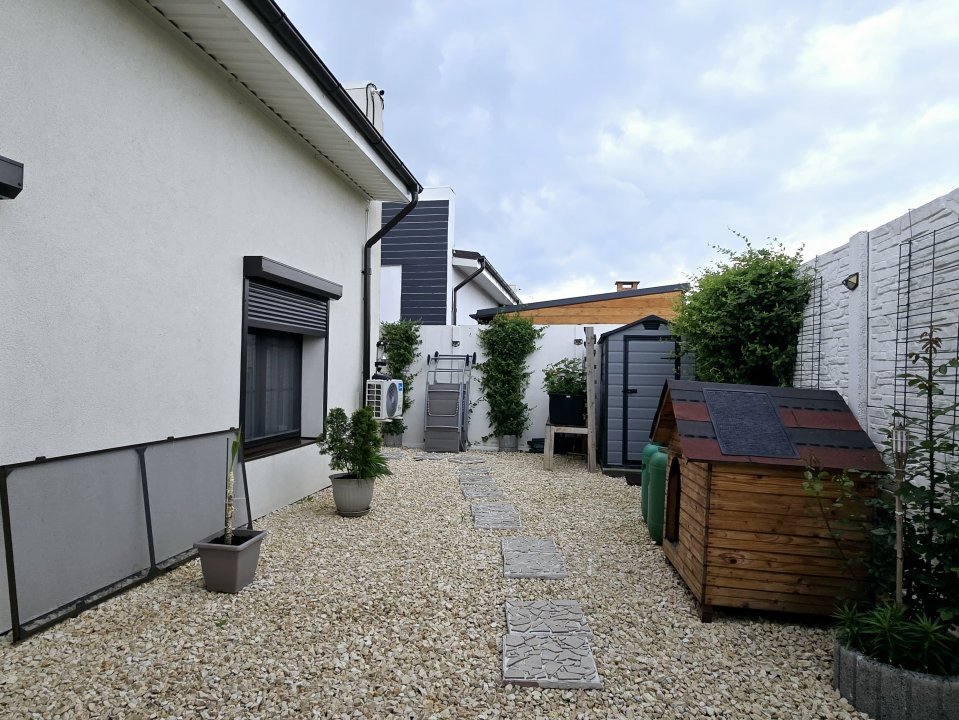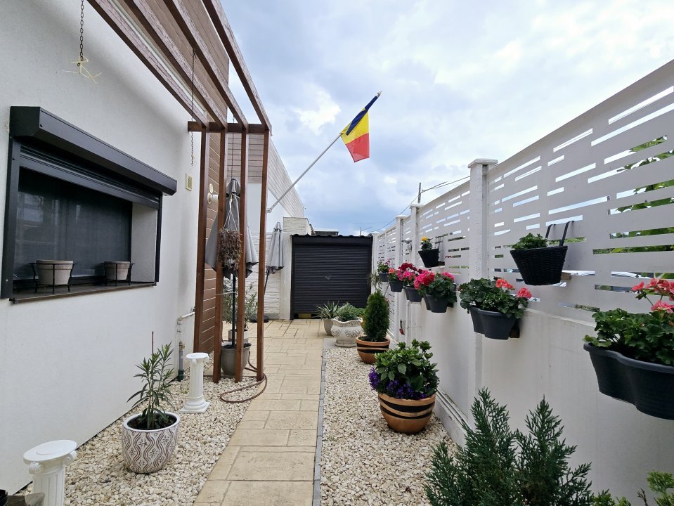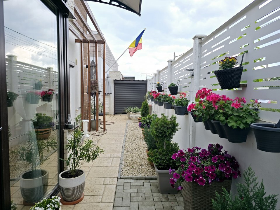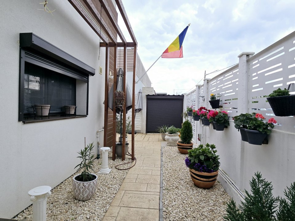Exteriorul este complet amenajat, cu alei pavate, spații verzi, flori, zonă de grătar cu plită, căsuță pentru depozitare și gard modern, totul pregătit pentru timp de calitate în aer liber.