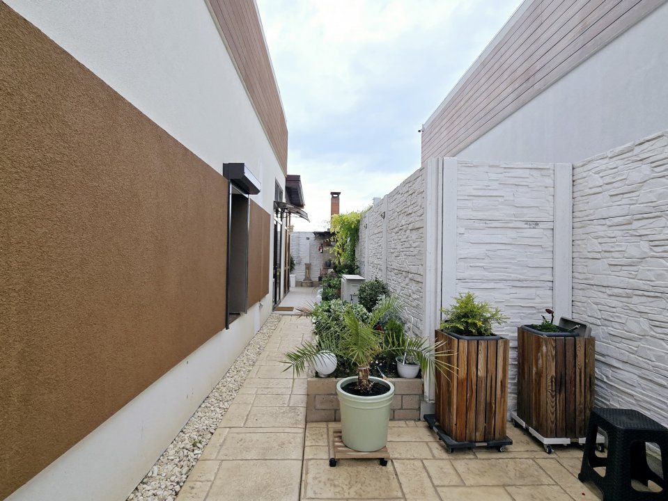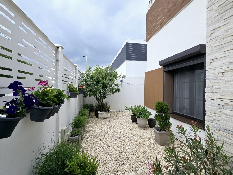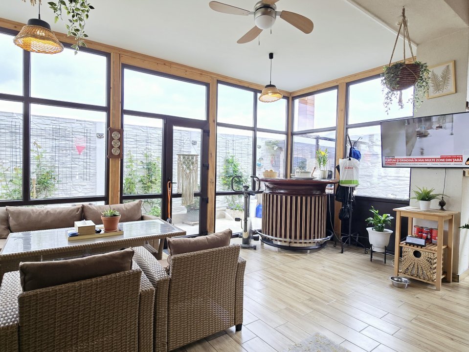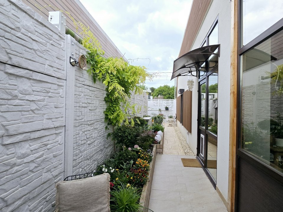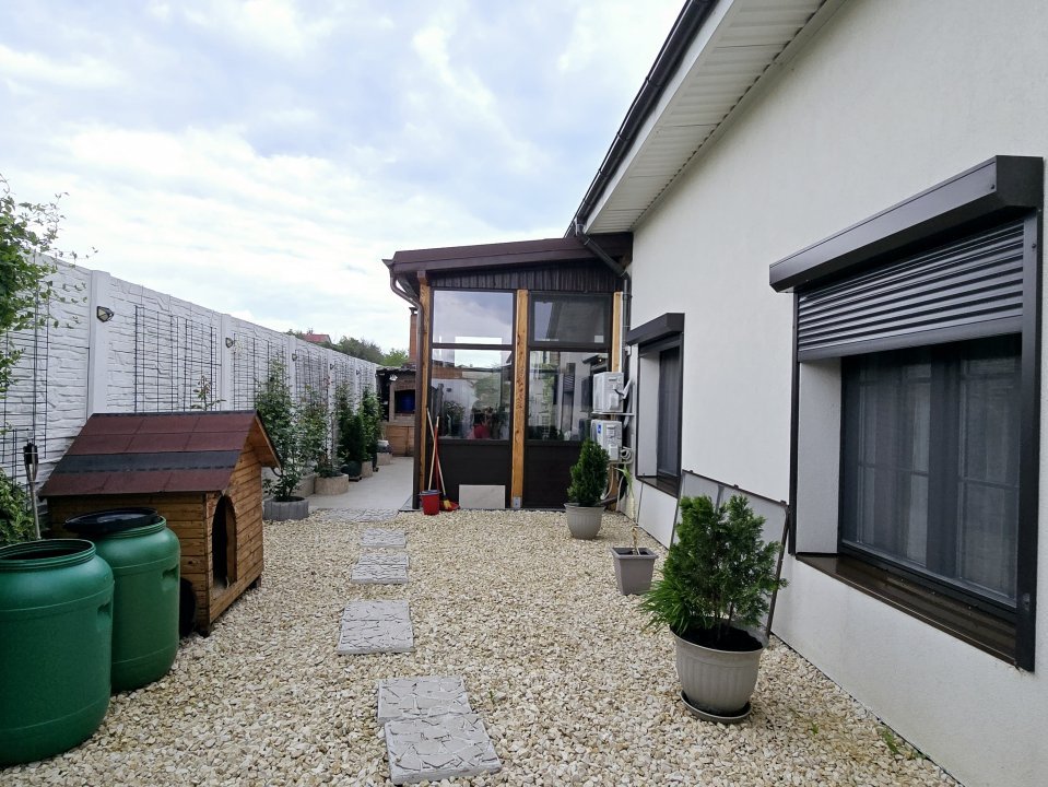 Exteriorul este complet amenajat, cu alei pavate, spații verzi, flori, zonă de grătar cu plită, căsuță pentru depozitare și gard modern, totul pregătit pentru timp de calitate în aer liber.