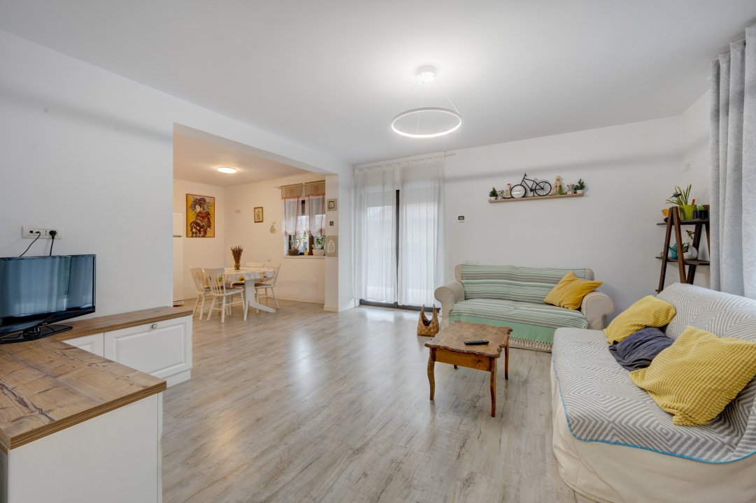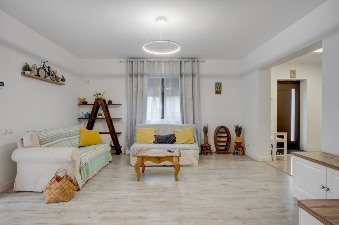 Bucataria este generoasa, mobilata Ikea si echipata cu toate electrocasnicele necesare: plita, cuptor, hota, masina de spalat vase, frigider. Tot in bucatarie este amenajat un loc pentru luat masa pentru 4 persoane. Bucataria este deschisa cu livingul dar exista si posibiitate de inchidere, la nevoie. Livingul este amenajat cu 2 canapele si comoda cu TV. Cele 3 dormitoare sunt complet mobilate.