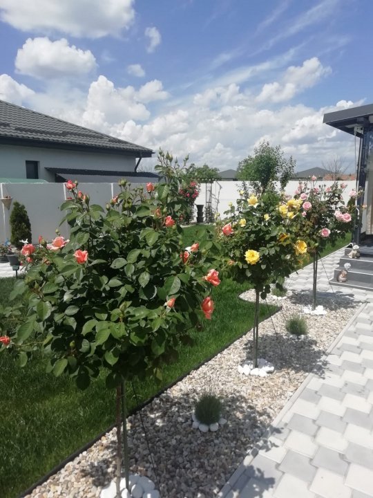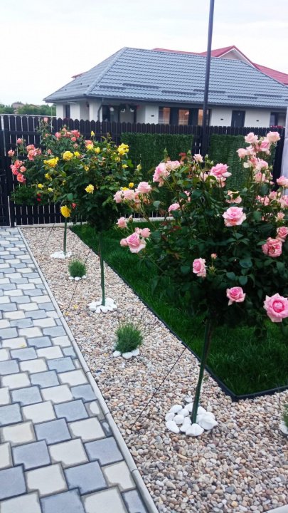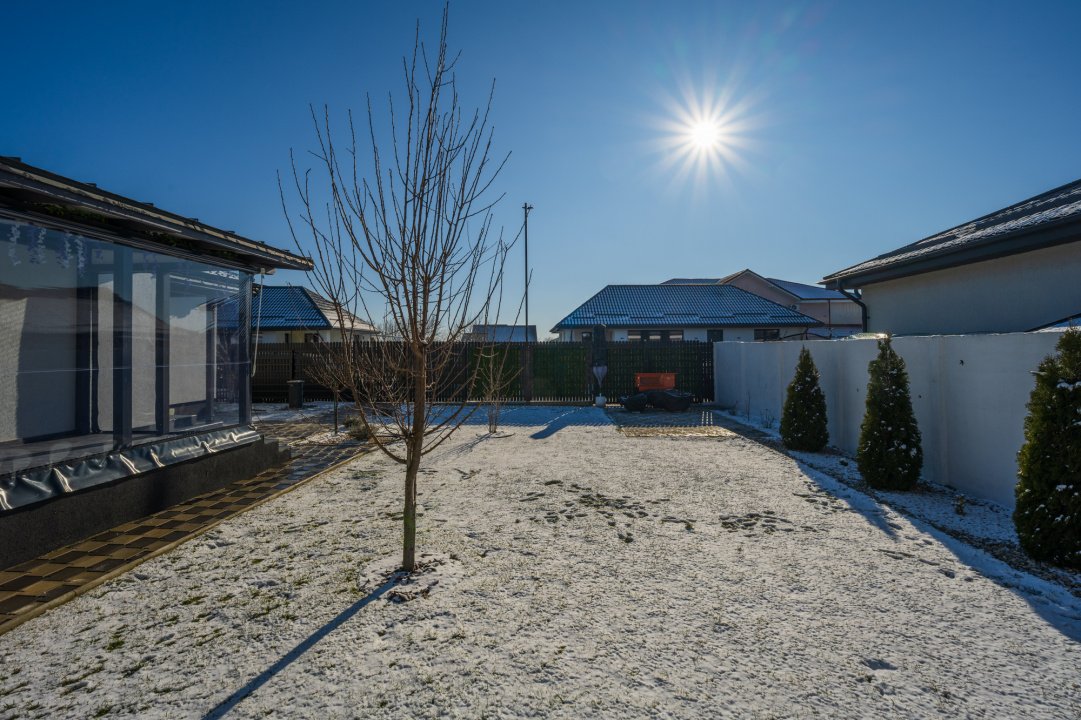 Curtea este matură, cu gazon, sistem de irigație și amenajare peisagistică modernă — un spațiu care invită la relaxare, joacă și timp petrecut în familie, într-un cadru intim și verde.