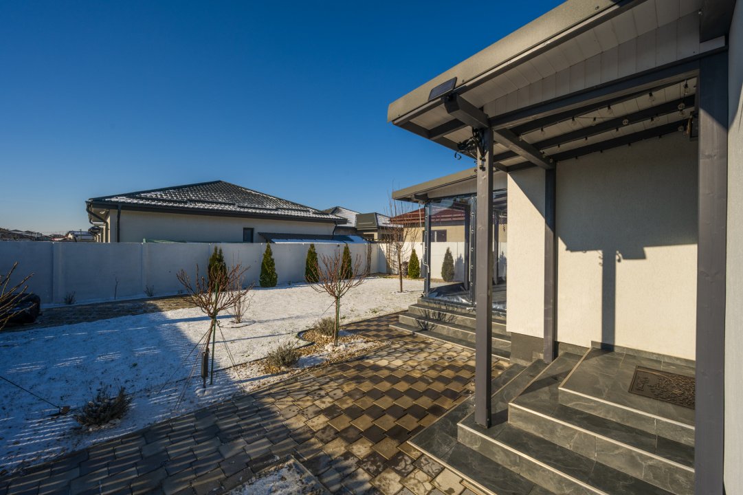 Încă de la exterior, casa transmite soliditate și bun gust. Acoperișul din tablă ondulată Bilka, în nuanță gri antracit, alături de sistemul de scurgere asortat, completează armonios arhitectura. Terenul de 378 mp, cu o deschidere generoasă către drumul de acces, oferă o curte aerisită, frumos organizată și extrem de bine valorificată.