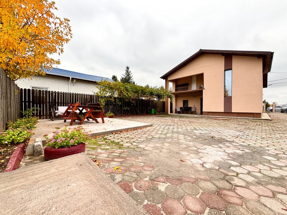 Curtea este amenajată cu alei pavate din piatră naturală și oferă spațiu generos pentru mai multe locuri de parcare dar si pentru a petrece timp de calitate cu familia și prietenii.