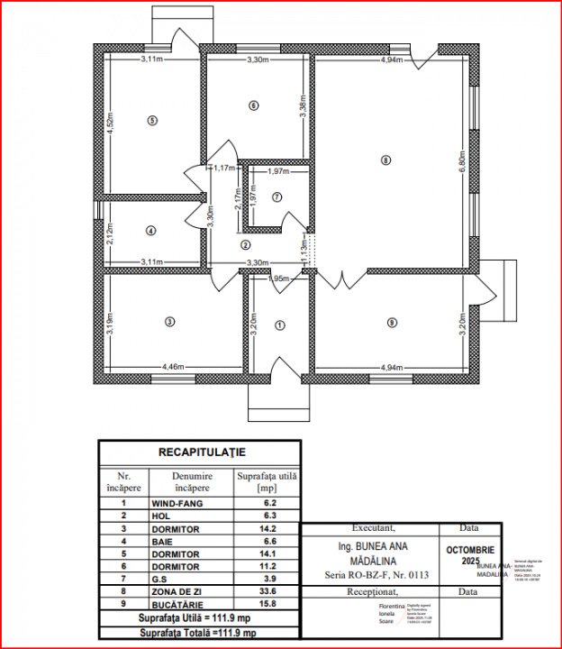 Casa cu 4 camere, constructie 2025, Parter cu suprafata utila 112 mp, amprenta 126 mp, teren 443 mp cu deschiderea 20 m.
