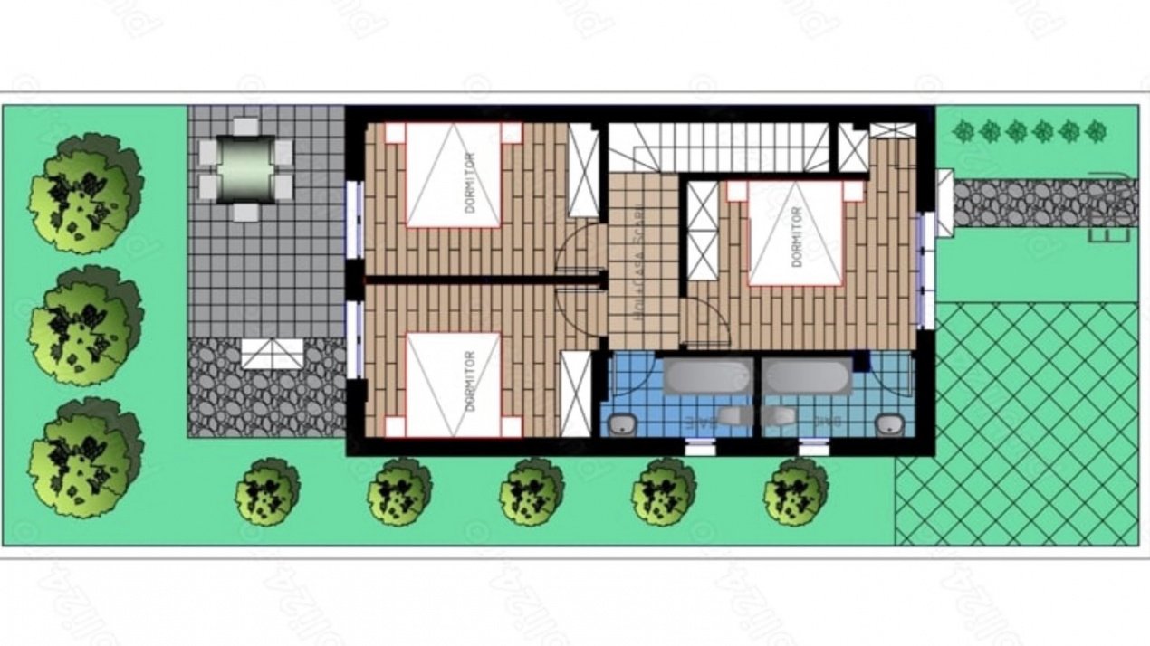 La etaj regasesti zona de noapte: dormitor matrimonial de 16 mp cu baie proprie, inca doua dormitoare de 14 si 13 mp si o baie suplimentara de 5 mp. Deasupra, podul de aproximativ 40 mp, izolat cu spuma poliuretanica cu celula inchisa, iti ofera un spatiu generos de depozitare.