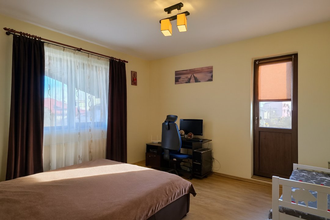 Interiorul este bine organizat, cu spații luminoase și încăperi generoase. La parter se află bucătăria, un living confortabil, un dormitor care poate fi folosit și ca birou, o baie, camera tehnică și spații de depozitare utile în viața de zi cu zi. Etajul continuă cu două dormitoare, o baie și un dormitor matrimonial care dispune de dressing și baie proprie — ideal pentru intimitate și confort.
