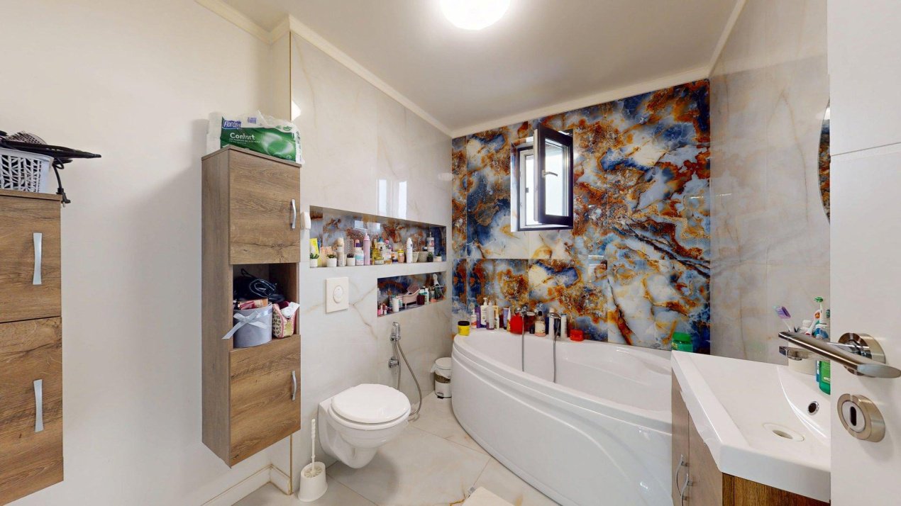 La etaj, zona de noapte este bine organizată și oferă intimitate. Cele trei dormitoare sunt luminoase și bine proporționate, iar unul dintre ele impresionează prin suprafața utilă de 27 mp, transformându-se într-un veritabil dormitor matrimonial. Baia de la etaj, dotată cu cadă și aerisire naturală, deserveste întreaga zonă.