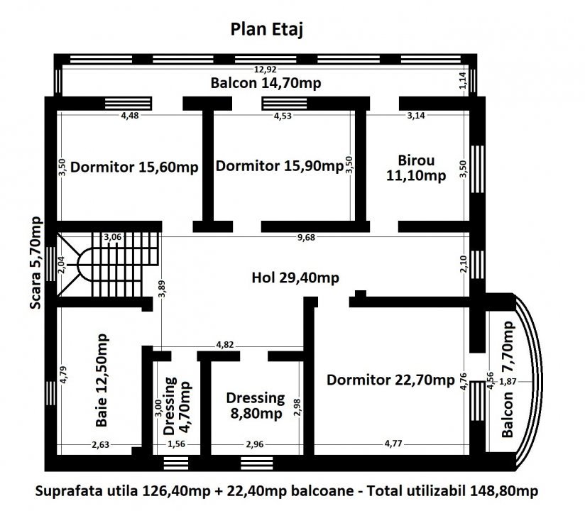 Etaj – Hol de acces cu 2 dressing-uri, 3 dormitoare (fiecare cu iesire in balcon), baie, birou, 2 balcoane si casa scarii – Total util 126,40mp + 22,40mp balcoane;