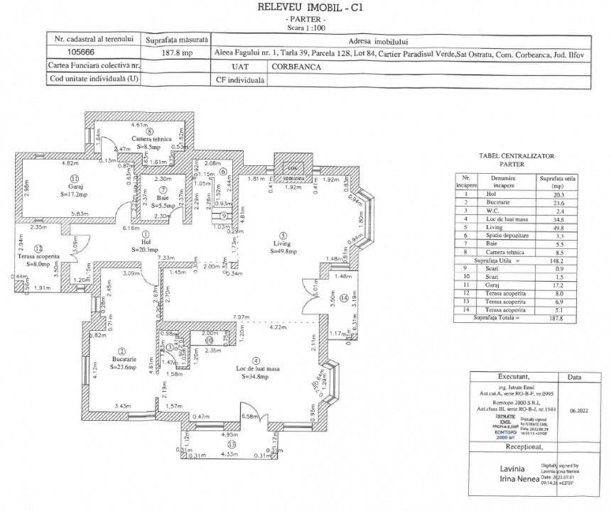 Proprietatea cu Structură: Parter + Etaj + Mansarda cu amprentă de 230 mp si suprafata desfasurata de 507 mp, a fost construita in anul 2007 si renovata integral in anul 2022, pe un teren cu supafata de 1095 mp, cu dubla deschidere de 20 ml si 42 ml.