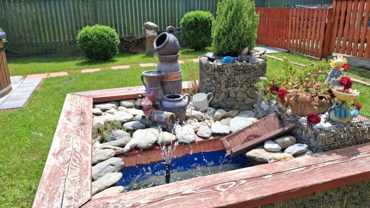 EXTERIOR IMOBIL: Cabanuta din lemn incalzita, cu terasa acoperita, un dormitor cu bucatarie open space si baie proprie, foisor mare cu gratar, plita si chiuveta, afumatoare, cuptor de paine, ciubar pe lemne, balansoar, fantana arteziana, aranjamente florale.
