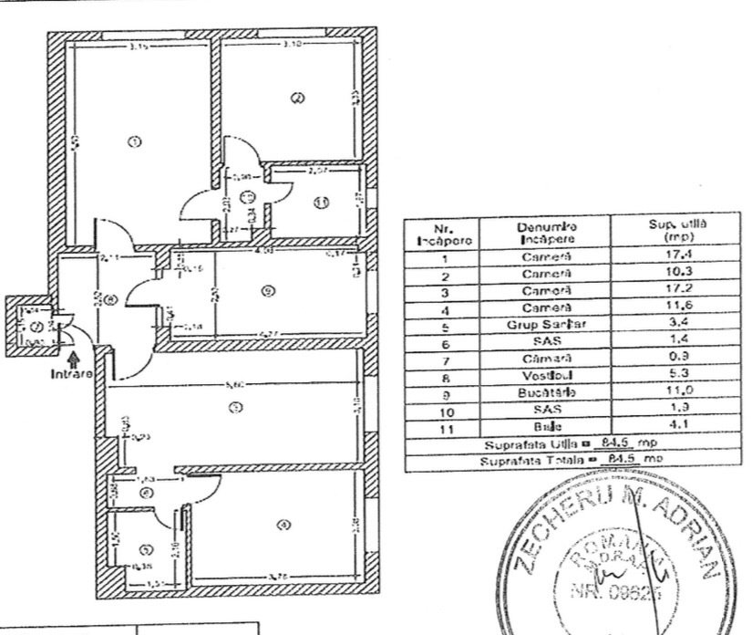 La prima vedere, ai putea crede ca sunt doua apartamente intr-unul singur – si nu ai gresi prea mult. In stanga si in dreapta bucatariei sunt cate doua camere si o baie, ca doua locuinte separate care impart doar bucataria. E o solutie ideala pentru doua familii care vor sa fie aproape, dar totusi independente. Sau pentru parinti si copii adulti care locuiesc impreuna. (Iar cadastrul reflecta exact aceasta compartimentare.)