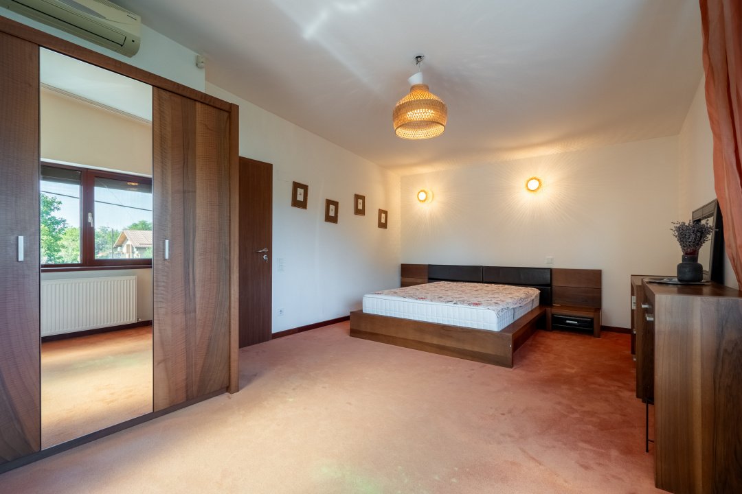 Casa este dispusa pe parter si etaj, avand dormitoare foarte spatioase, unul la parter si doua la etaj, suprafete vitrate mari, intimitate si eleganta.