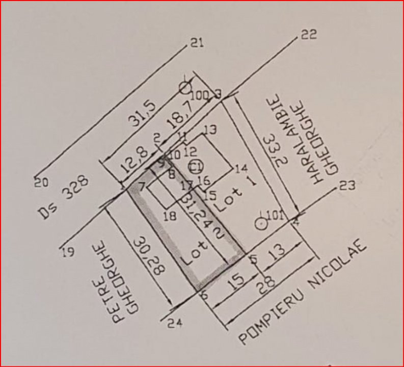 Terenul beneficiază de front stradal de 13 ml, lungime de aproximativ 30 ml, iar lățimea în partea din spate este de 15 ml, oferind o formă avantajoasă pentru construirea unei case.