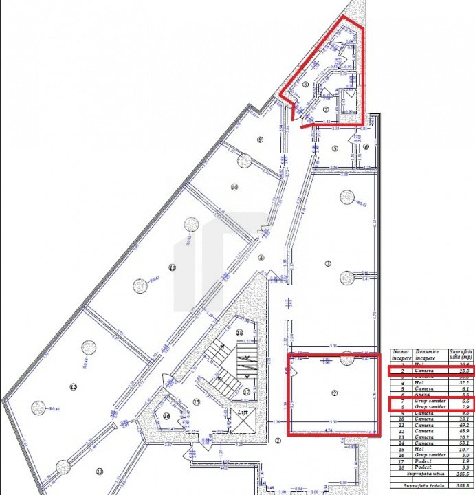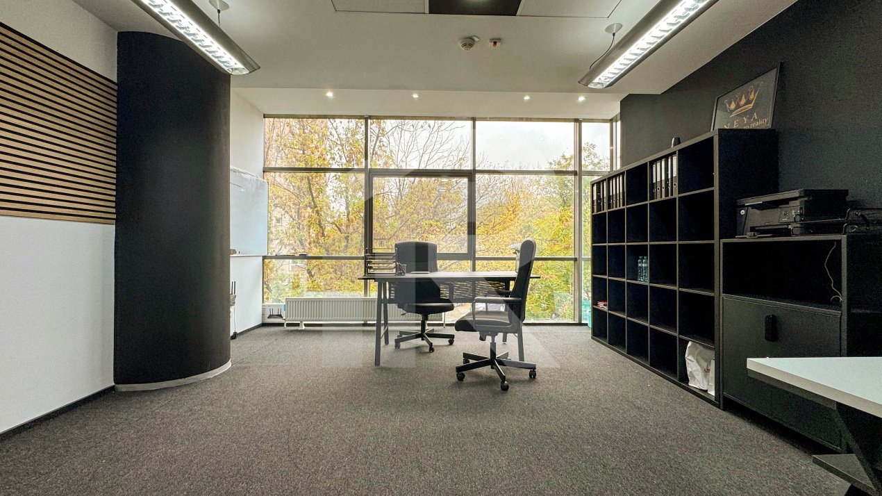 Spațiul de birouri  se află la etajul 1, dispune de o cameră având suprafața utilă de 23.8 mp la care se adaugă spațiile comune. Spațiul are acces la doua grupuri sanitare comune.