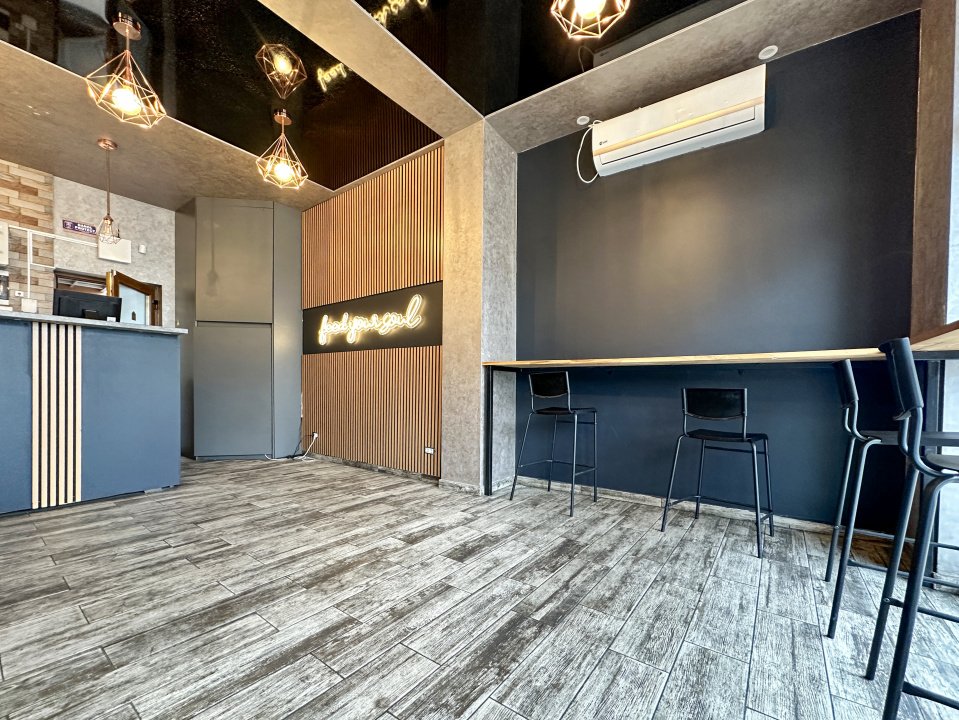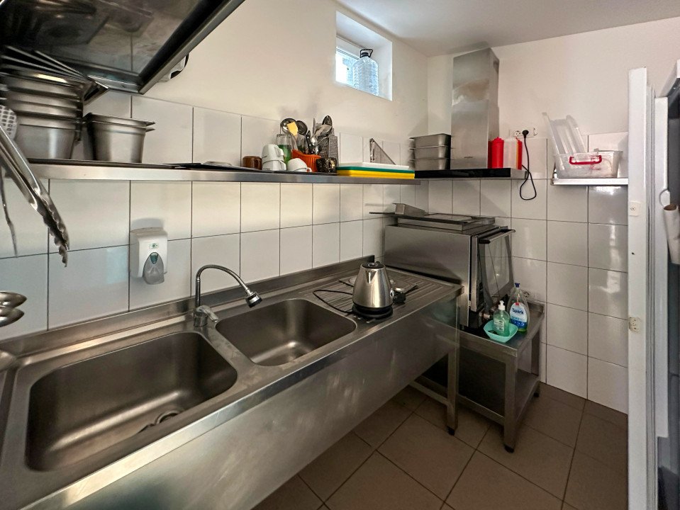 Spatiu de servire clienti in suprafata de 40 mp + bucatarie si anexe in suprafata de 20 mp + terasa de aproximativ 20 mp