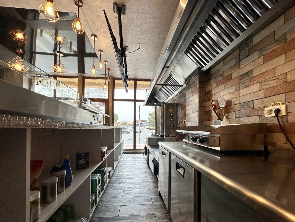 Spatiu comercial - Afacere la cheie de inchiriat pe term lung, pretabila fast-food sau shaormerie, impreuna cu o garsoniera gata de locuit la etajul 1.