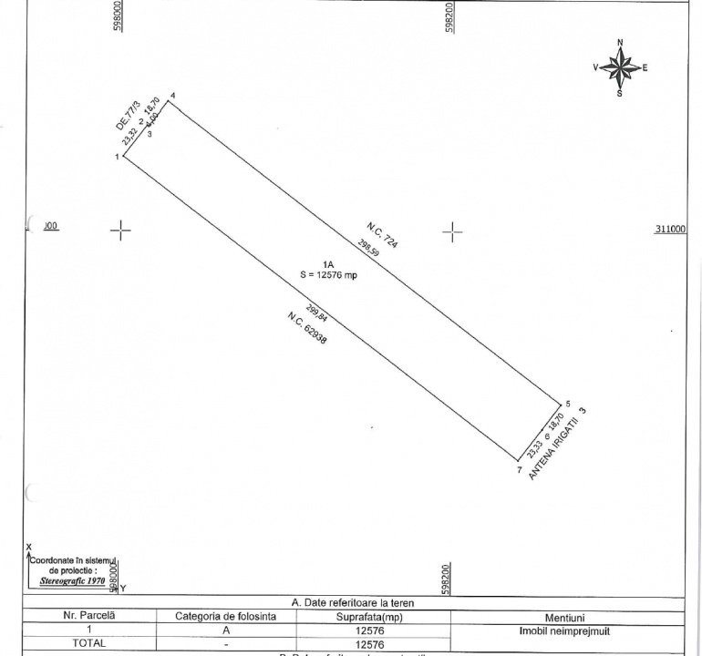 Vă propunem spre vânzare un teren extravilan în suprafață măsurată de 12.576 de 12.711 mp (din acte) în zona Primaverii din Comuna Berceni, Ilfov.