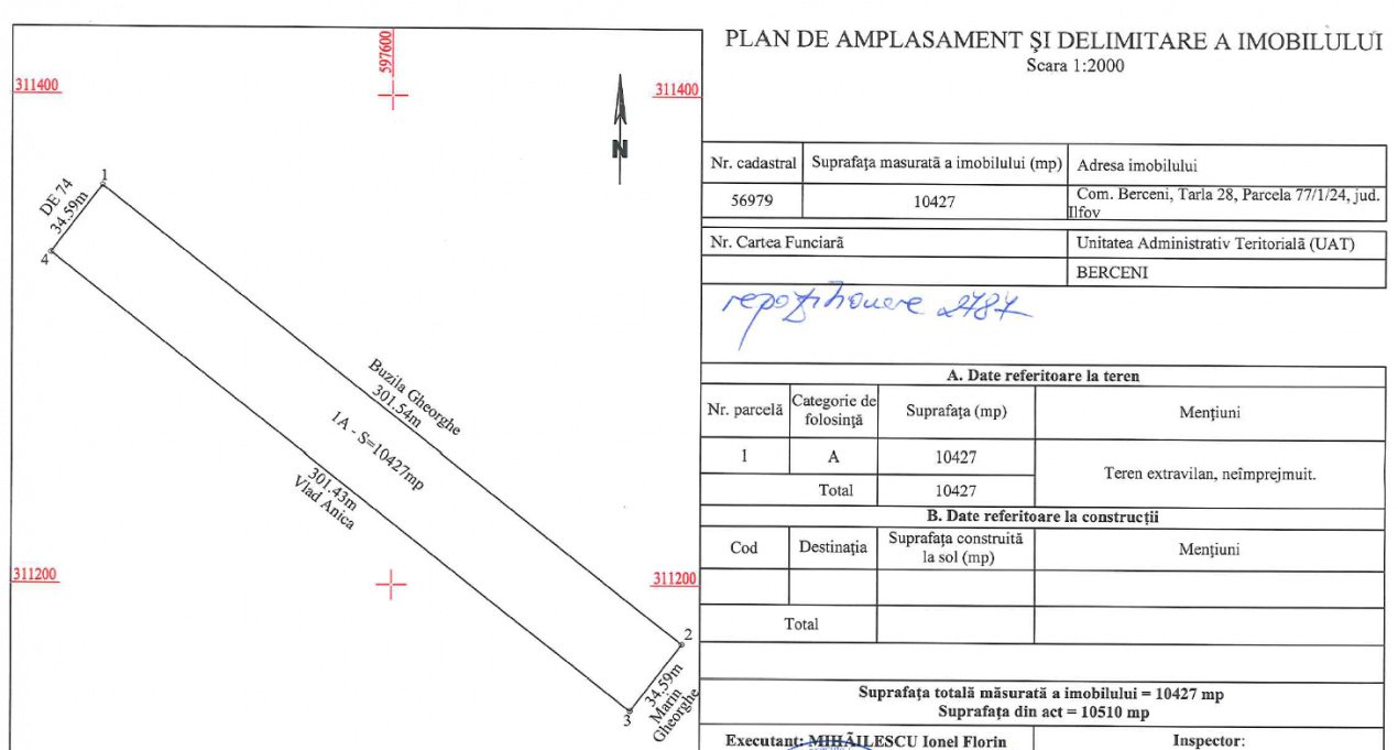 Vă propunem spre vânzare un teren extravilan în suprafață măsurată de 10.427 de 10.510 mp (din acte) în zona Primaverii din Comuna Berceni, Ilfov.