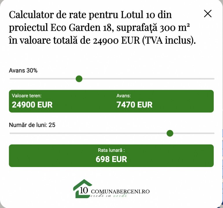 Prețurile nu includ TVA, iar avansul și ratele lunare diferă de la un proiect de loturi la altul.