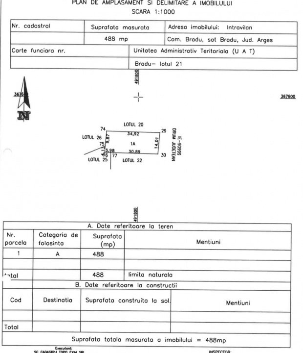 In Bradu , la aproximativ 5 minute de Pitesti , intr-o zona in plina dezvoltare va propunem spre achizitie un superb teren intravilan de 488 mp cu deschidere de 14 m la Drumul Judetean Pitesti- Bradu . Terenul este complet plan si este ideal atat pentru constructia unei case cat si pentru dezvoltarea unei afaceri datorita pozitionarii lui la drumul principal. La limita proprietatii avem apa, gaze, curent electric si canalizare.. Echipa noastra va poate consilia de la vizionare, obtinere credit, inchidere tranzactie. Toate acestea cu comision zero pentru cumparator. Va asteptam cu drag la vizionare!