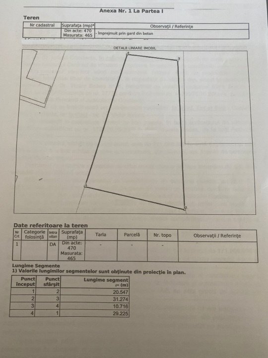 Terenul are o suprafață de 465 mp, beneficiind de o deschidere generoasă de 29,225 ml, ideală pentru construirea unei locuințe individuale, duplex sau pentru investiție. Proprietatea este împrejmuită cu gard betonat, oferind siguranță și delimitare clară.