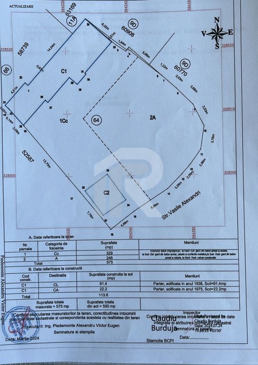 Proprietatea are un teren de 575 mp și o casă din cărămidă (amprentă 90 mp), care necesită renovare completa sau reconstrucție.