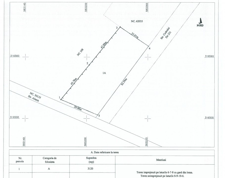 Va propunem spre vanzare un teren intravilan in suprafata de 3120mp, cu deschidere la Str. Alunis DJ 401A (profil drum 24,00m) de 39ml si deschidere la Str. Codrului De 231 (profil drum 13,00m) de 83,6ml.