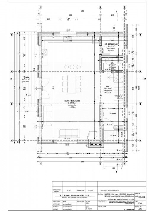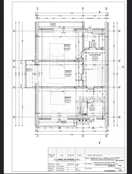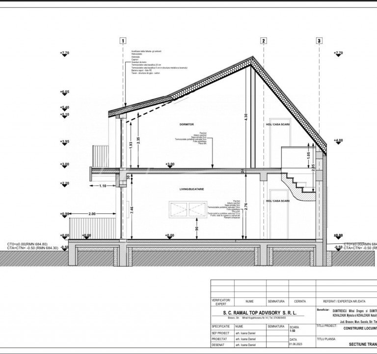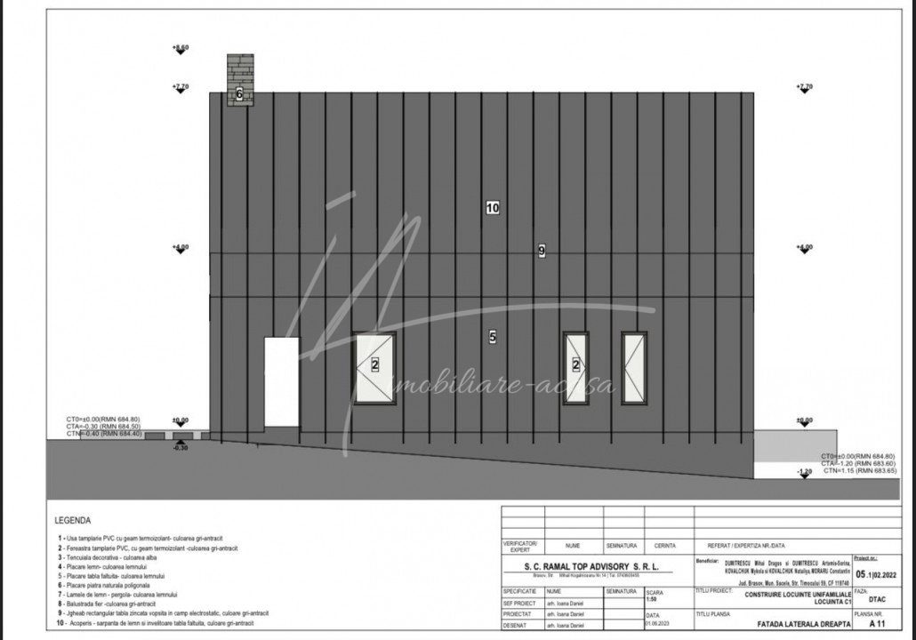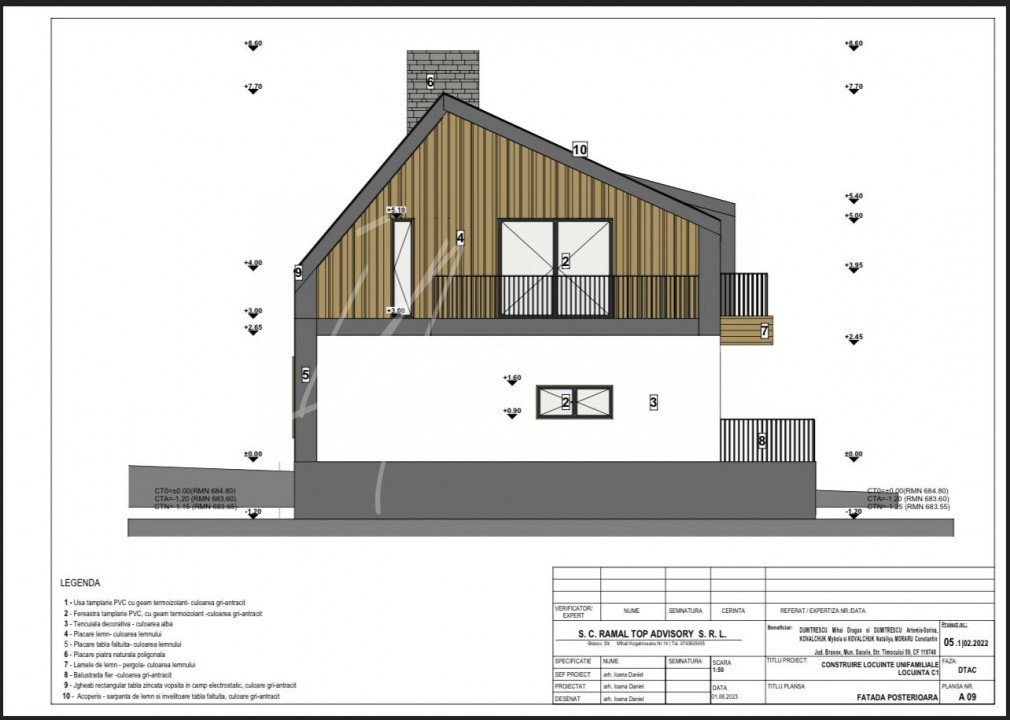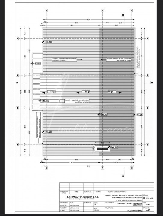 In baza documentatiei PUD aprobate de catre Primaria Mun. Sacele s-a dezmembrat terenui, rezultand 8 parcele pentru care s-a solicitat si obtinut pentru fiecare parcela autorizatie de construire a unei case de vacanta ''clasice'', cu fundatie din beton, stalpi si placa beton iar inchiderile cu caramida pluricelulara, avand o amprenta la sol de 98 mp, un regim de inaltime de P+1M si o suprafata construita totala de 179 mp. Am atasat planurile casei care este structurata foarte practic cu hol intrare, living cu bucatarie deschisa, camera tehnica si grup sanitar la parter. Accesul catre etajul mansardat se face pe o scara in laterala dreapta a casei care conduce catre cele 3 dormitoare, cel matrimonial cu 21 mp si baie 'en-suite' si alte 2 dormitoare care sunt deservite de o baie cu acces din hol. Fiecare dormitor este prevazut cu un balcon. Exista posibilitatea de a reconfigura acest proiect, fie inchiderea bucatariei, amenajarea unei camere/birou la parter sau modificarea vreunui dormitor de la etaj, daca nu se modifica elementele de structura ale casei sau fatadele asa cum au fost avizate in autorizatie de construire.